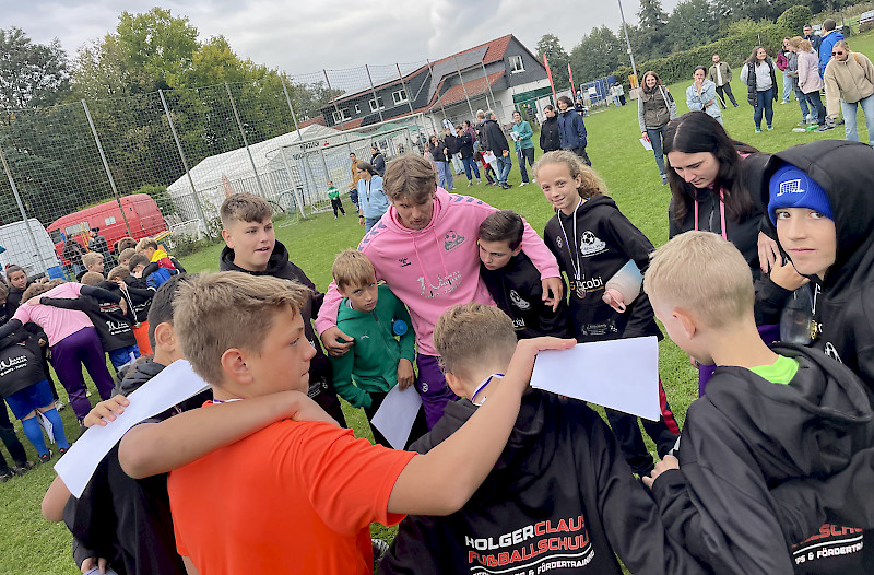 Währenddessen erfolgte auf dem Platz eine genauso lange Ansprache von Julian, der sich Protagonisten der Fußballwoche schnappte.