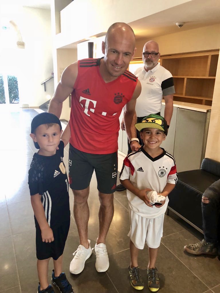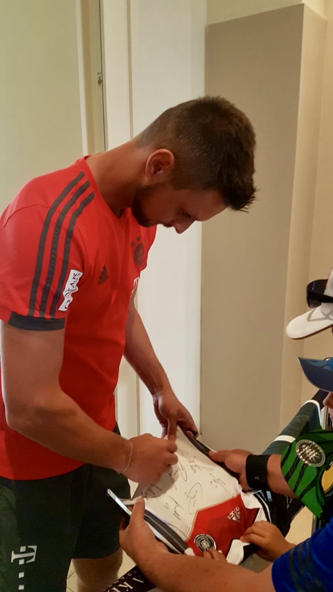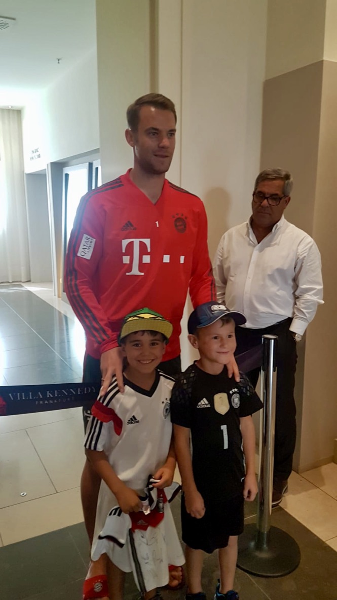 Was für ein tolles Erlebnis! Da fuhr unser kleiner Campteilnehmer Mazen mit Papa Majd, und Nachbarfreund Moritz am 12.08.2018, nach Frankfurt am Main. Zum Supercupfinale zwischen der Frankfurter Eintracht und dem FC Bayern München. Irgendjemand musste den dreien nicht nur 'gesteckt' haben, wo sich der FC Bayern München auf dieses Spiel vorbereitet, sondern auch, wie man möglichst nah an die großen Idole im Hotel Rocco Forte Villa Kennedy heran kam. Ungestört konnten die beiden mit einigen Bayern Spielern/-trainern Bilder machen, und sich Autogramme abholen;-) Es bleibt anzunehmen, dass die beiden diesen Tag, der auch noch mit einem Sieg ihrer Lieblingsmannschaft endete, nicht so schnell vergessen werden.