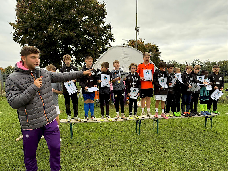 Währenddessen erfolgte auf dem Platz eine genauso lange Ansprache von Julian, der sich Protagonisten der Fußballwoche schnappte.