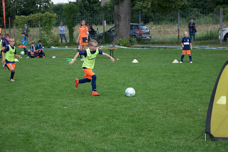 Wie bereits in den vergangenen 3 Camps teilten wir die Kids in 5 Gruppen ein, wobei jede Gruppe individuell trainierte/-übte. Auch die Turnierspiele fanden jeweils in den 12-15 Kids starken Gruppe statt. So kam es zu keinerlei ‚Durchmischung‘. Und das auch weder beim Gang in die Kabine, noch beim Gang zum Mittagessen in die TSV-Gaststätte. Safety first, siehe oben:)