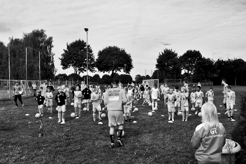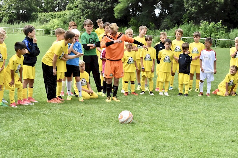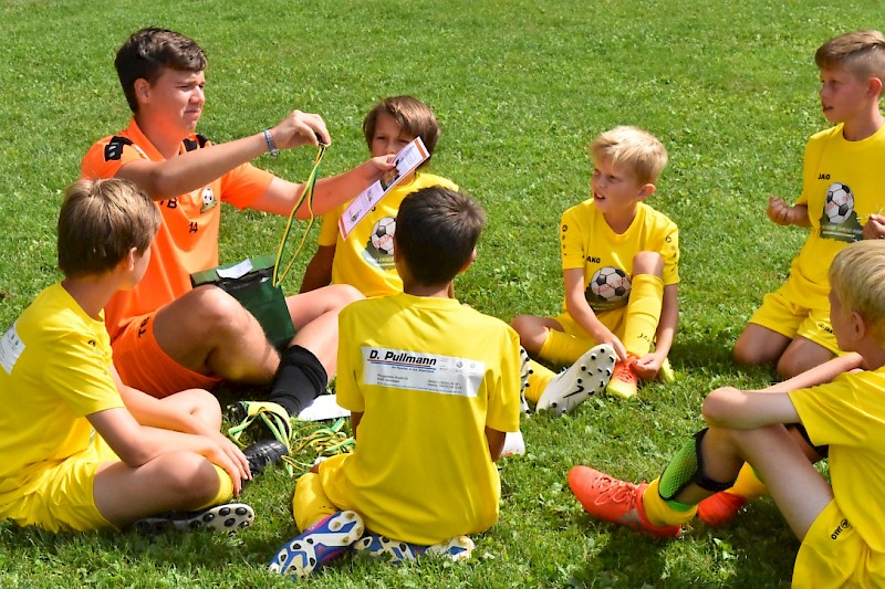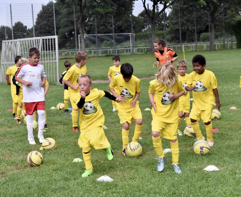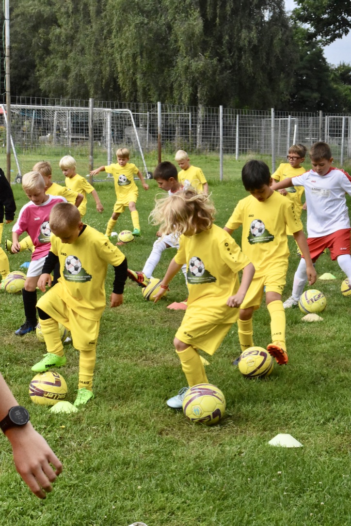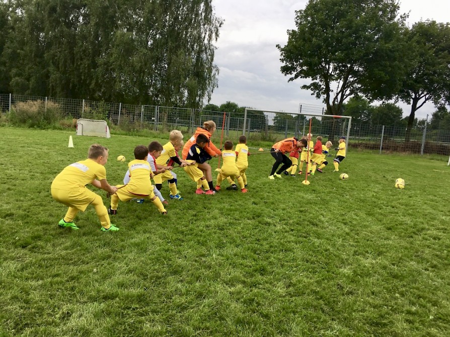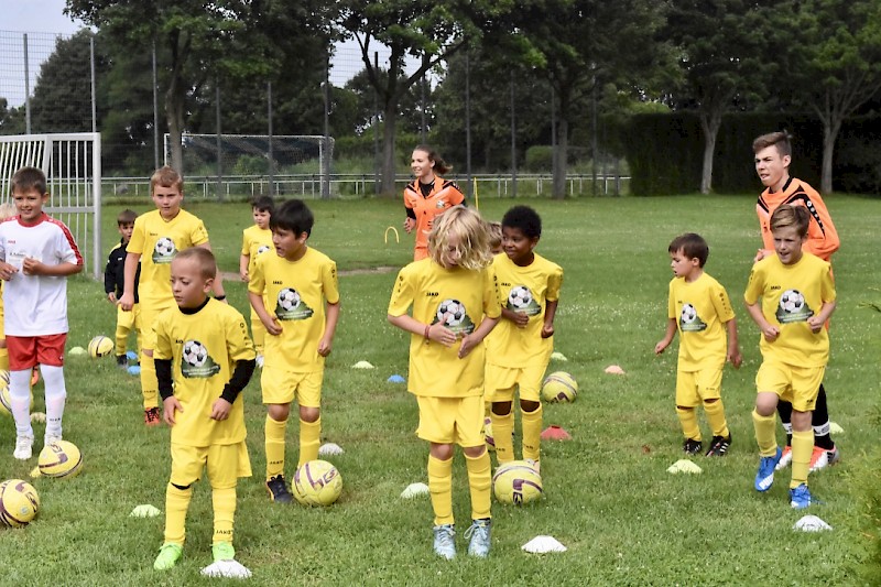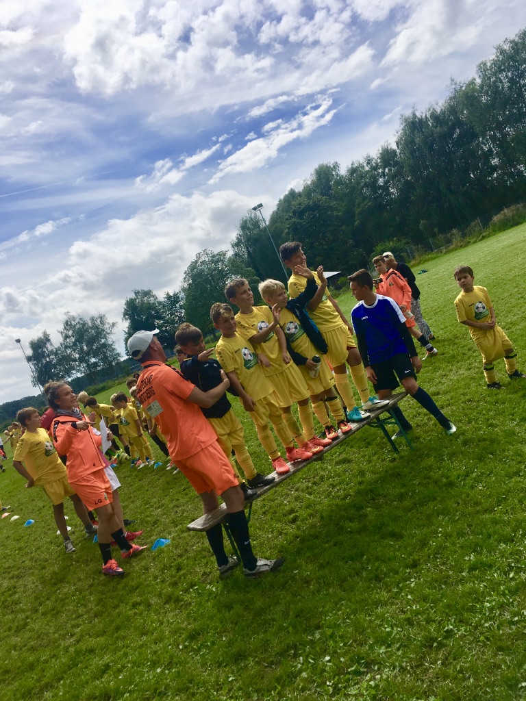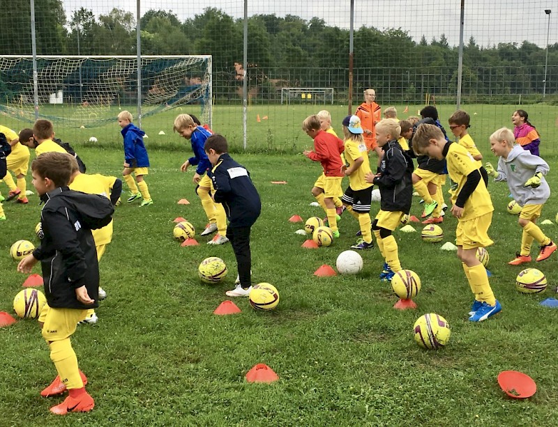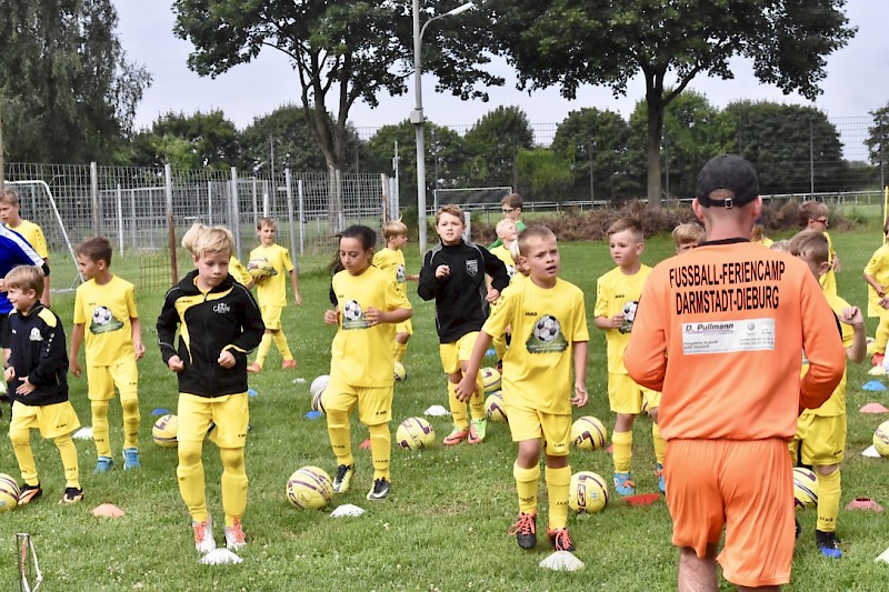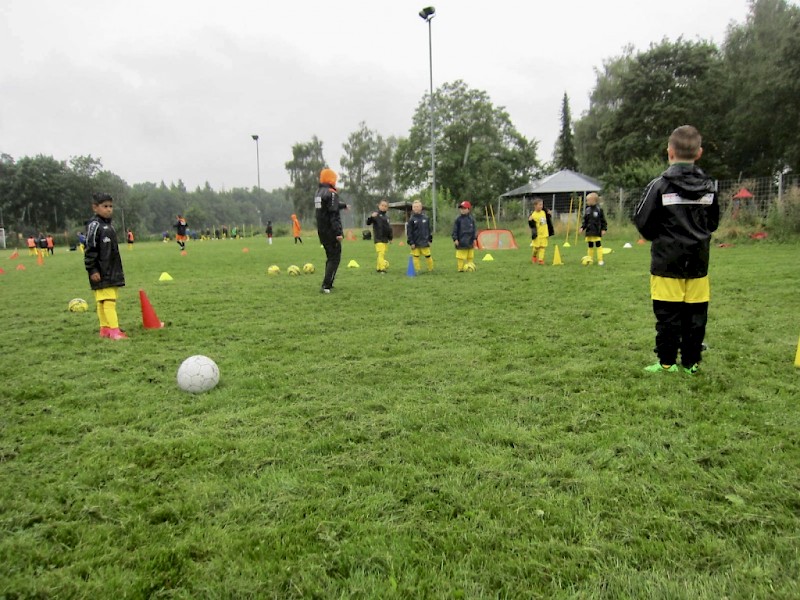 Die Wettervorhersage für die Campwoche traf zu: Regen! Bis einschließlich Mittwoch morgen. Dann ließ sich endlich die Sonne blicken, und es wurde etwas heller über der schönen Altheimer Sportanlage. Das hatten wir auch mehr als verdient. Alle Miteinander - Kids, Eltern, das Kompetenzteam mit Henni, Suzy, Jule, und Hannah , unserer Fotografin Milena, sowie den Trainern Thimo, Abu, Marc, Mareike, Laura, Philipp, Henrike, Maverick, Harry, Henrik, Tom, und Holger. Aber selbstverständlich ging's nicht erst mit der Sonne los. Unmittelbar nach der Begrüßung am Montag morgen, dem Verteilen der Ausstattung, legten wir mit den Kids auch schon los. Wie immer in 6 verschiedene Teams nach Jahrgängen eingeteilt, deckten die Trainer die gesamte Woche über mit allen fussballerischen Schwerpunkten ab. Einige Male auch mit der ein oder anderen spaßigen Wettkampfeinlage fern des runden Leders;-) Und die Kids machten wirklich klasse mit - allen machte es sichtlich Spaß. Ob morgens mit dem 'Warm up' bei Thimo, oder die Jüngsten bei Maverick (Bild unten)...