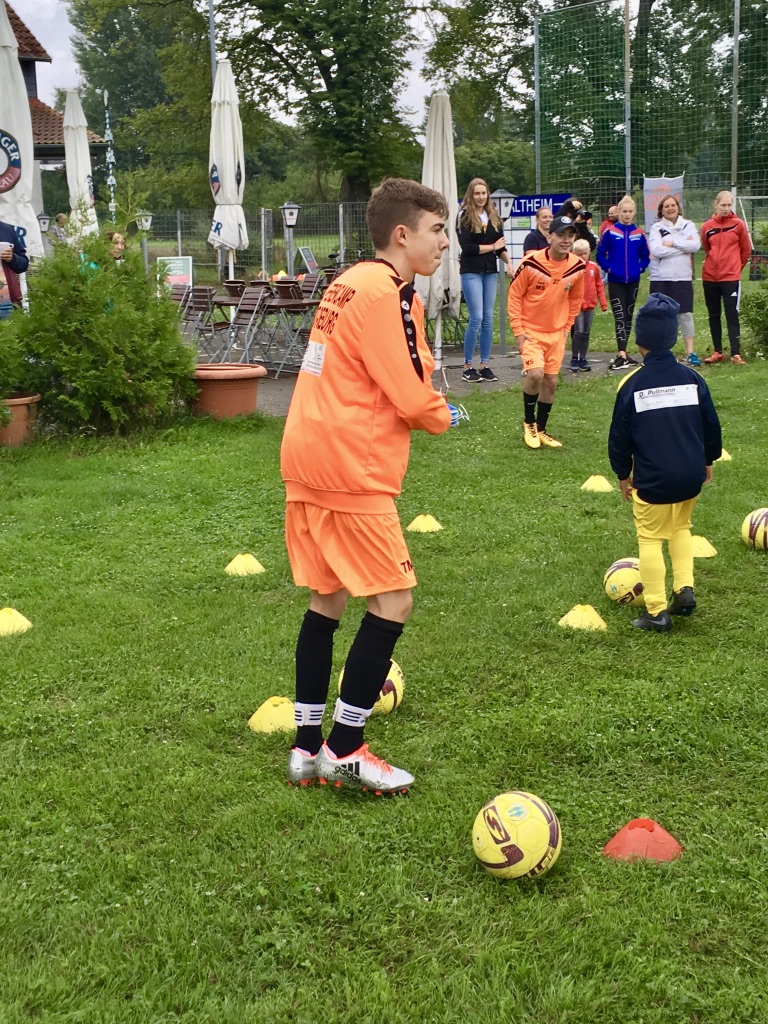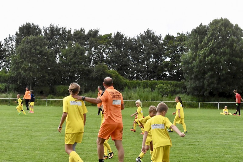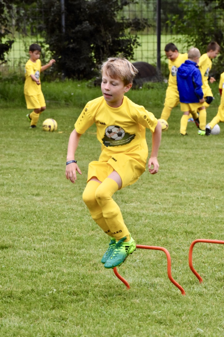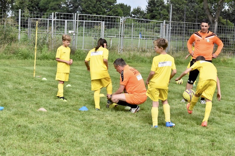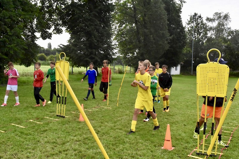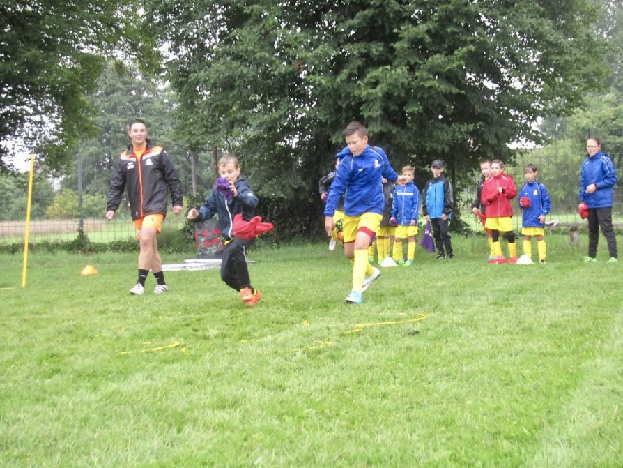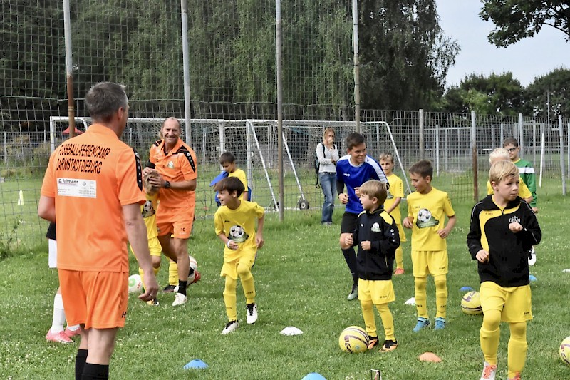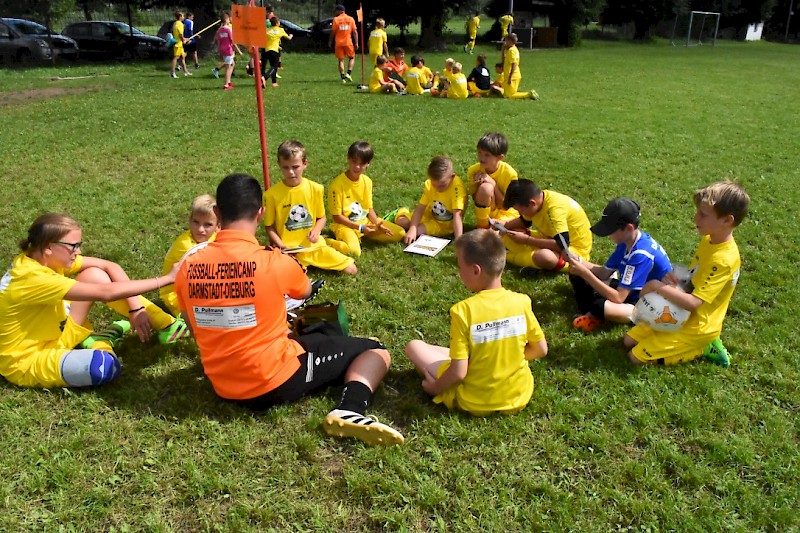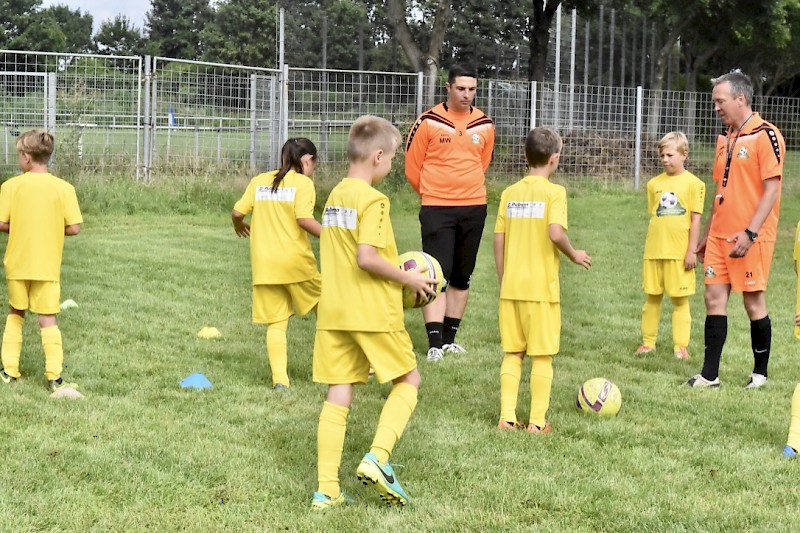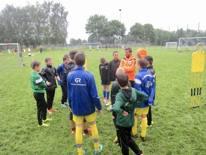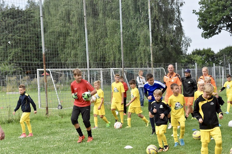 Die Wettervorhersage für die Campwoche traf zu: Regen! Bis einschließlich Mittwoch morgen. Dann ließ sich endlich die Sonne blicken, und es wurde etwas heller über der schönen Altheimer Sportanlage. Das hatten wir auch mehr als verdient. Alle Miteinander - Kids, Eltern, das Kompetenzteam mit Henni, Suzy, Jule, und Hannah , unserer Fotografin Milena, sowie den Trainern Thimo, Abu, Marc, Mareike, Laura, Philipp, Henrike, Maverick, Harry, Henrik, Tom, und Holger. Aber selbstverständlich ging's nicht erst mit der Sonne los. Unmittelbar nach der Begrüßung am Montag morgen, dem Verteilen der Ausstattung, legten wir mit den Kids auch schon los. Wie immer in 6 verschiedene Teams nach Jahrgängen eingeteilt, deckten die Trainer die gesamte Woche über mit allen fussballerischen Schwerpunkten ab. Einige Male auch mit der ein oder anderen spaßigen Wettkampfeinlage fern des runden Leders;-) Und die Kids machten wirklich klasse mit - allen machte es sichtlich Spaß. Ob morgens mit dem 'Warm up' bei Thimo, oder die Jüngsten bei Maverick (Bild unten)...