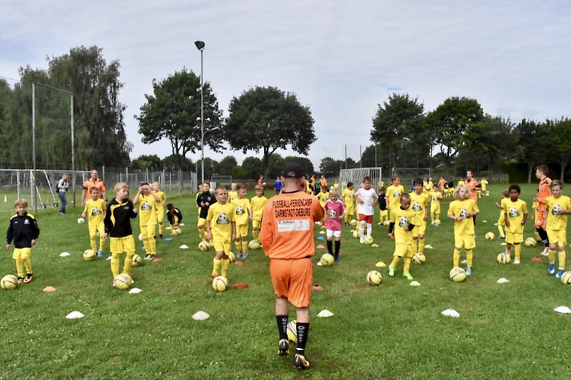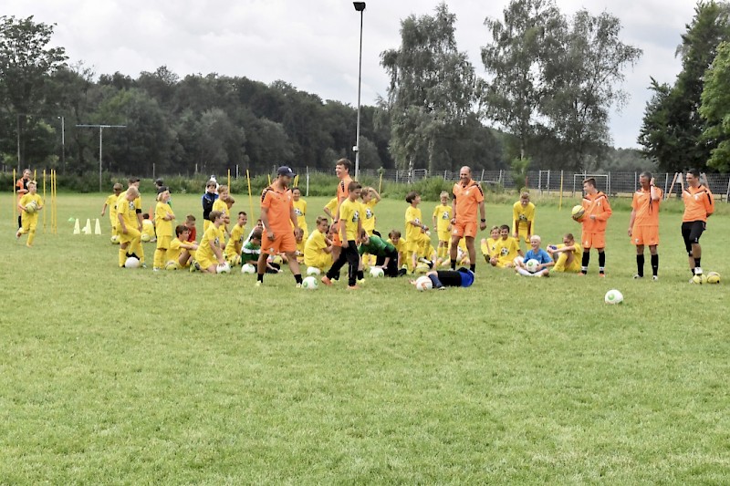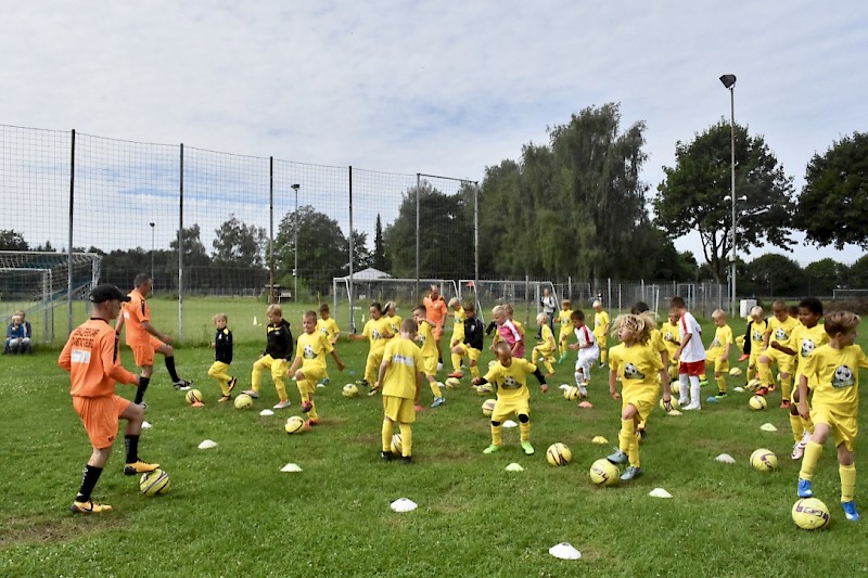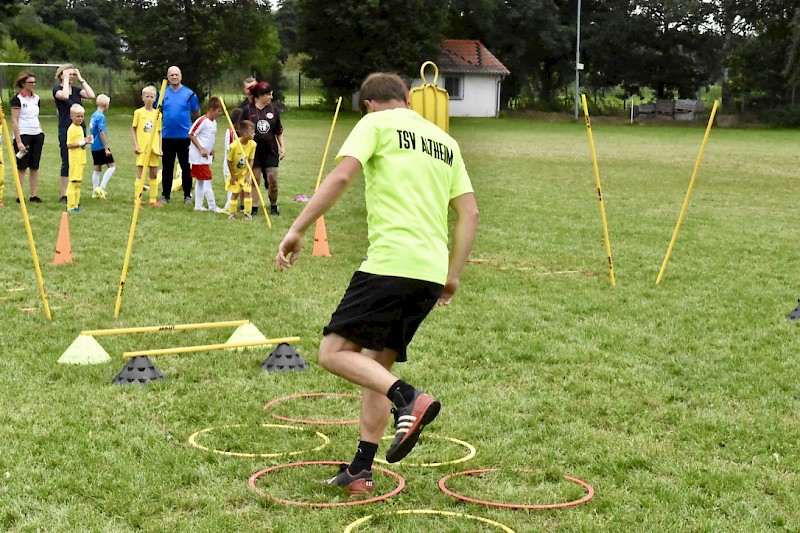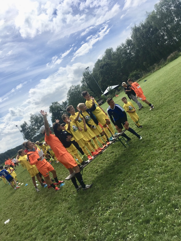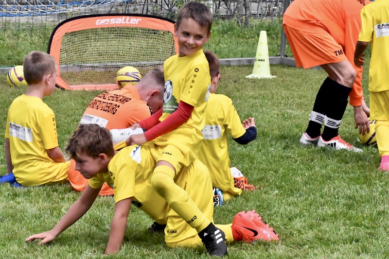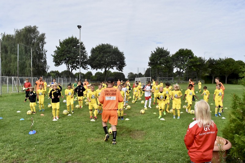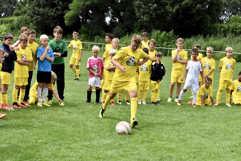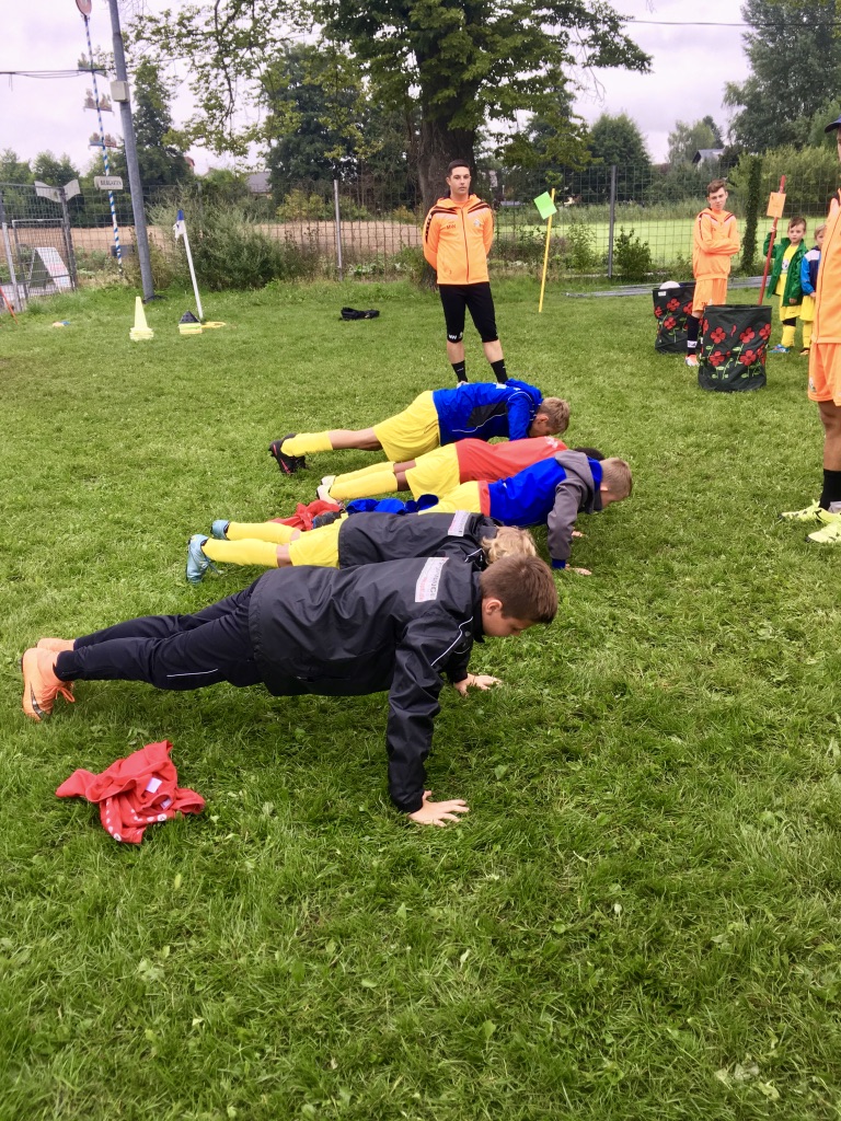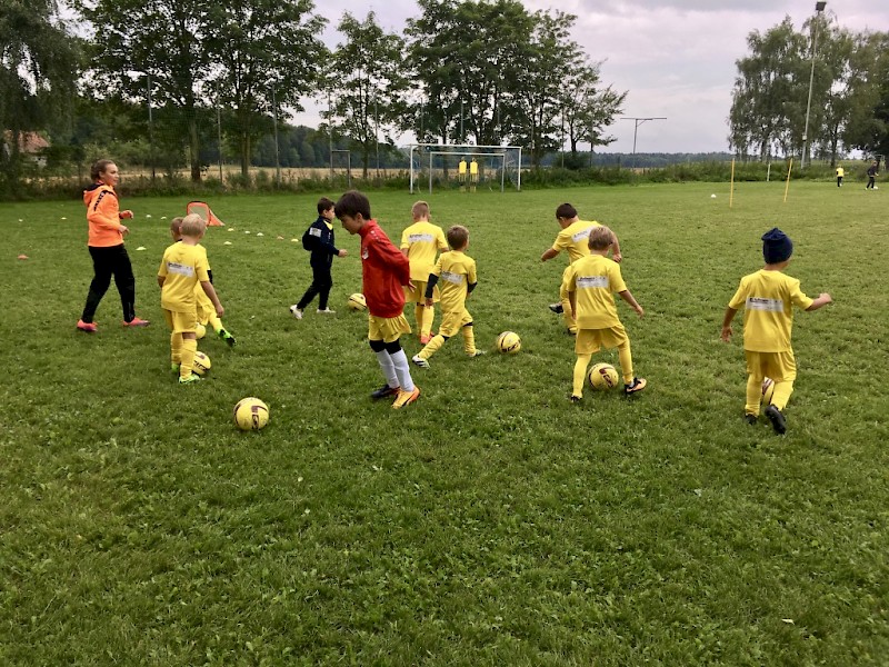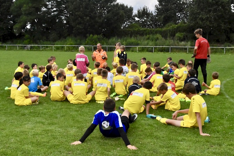 Die Wettervorhersage für die Campwoche traf zu: Regen! Bis einschließlich Mittwoch morgen. Dann ließ sich endlich die Sonne blicken, und es wurde etwas heller über der schönen Altheimer Sportanlage. Das hatten wir auch mehr als verdient. Alle Miteinander - Kids, Eltern, das Kompetenzteam mit Henni, Suzy, Jule, und Hannah , unserer Fotografin Milena, sowie den Trainern Thimo, Abu, Marc, Mareike, Laura, Philipp, Henrike, Maverick, Harry, Henrik, Tom, und Holger. Aber selbstverständlich ging's nicht erst mit der Sonne los. Unmittelbar nach der Begrüßung am Montag morgen, dem Verteilen der Ausstattung, legten wir mit den Kids auch schon los. Wie immer in 6 verschiedene Teams nach Jahrgängen eingeteilt, deckten die Trainer die gesamte Woche über mit allen fussballerischen Schwerpunkten ab. Einige Male auch mit der ein oder anderen spaßigen Wettkampfeinlage fern des runden Leders;-) Und die Kids machten wirklich klasse mit - allen machte es sichtlich Spaß. Ob morgens mit dem 'Warm up' bei Thimo, oder die Jüngsten bei Maverick (Bild unten)...
