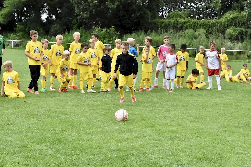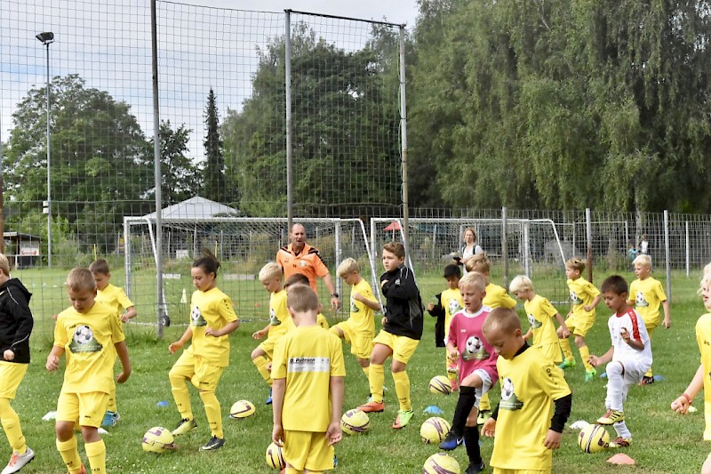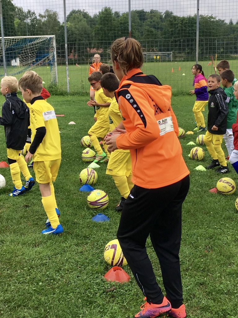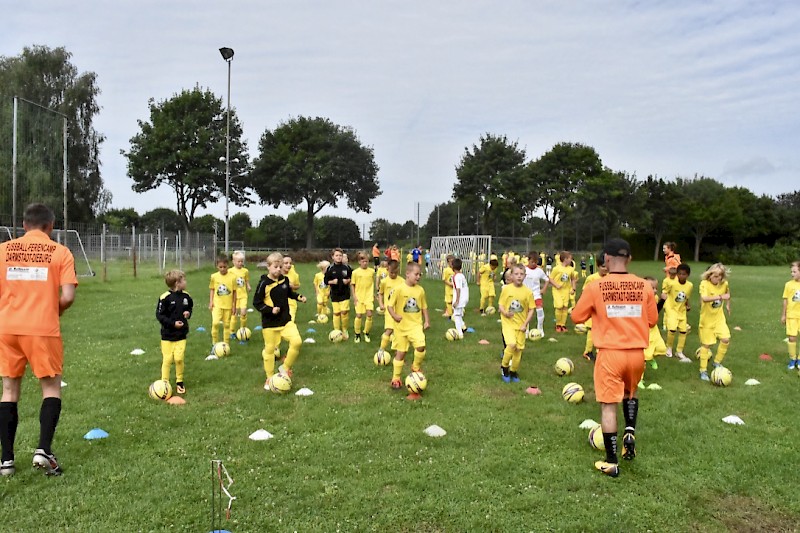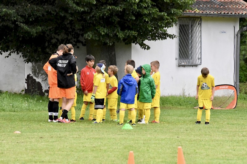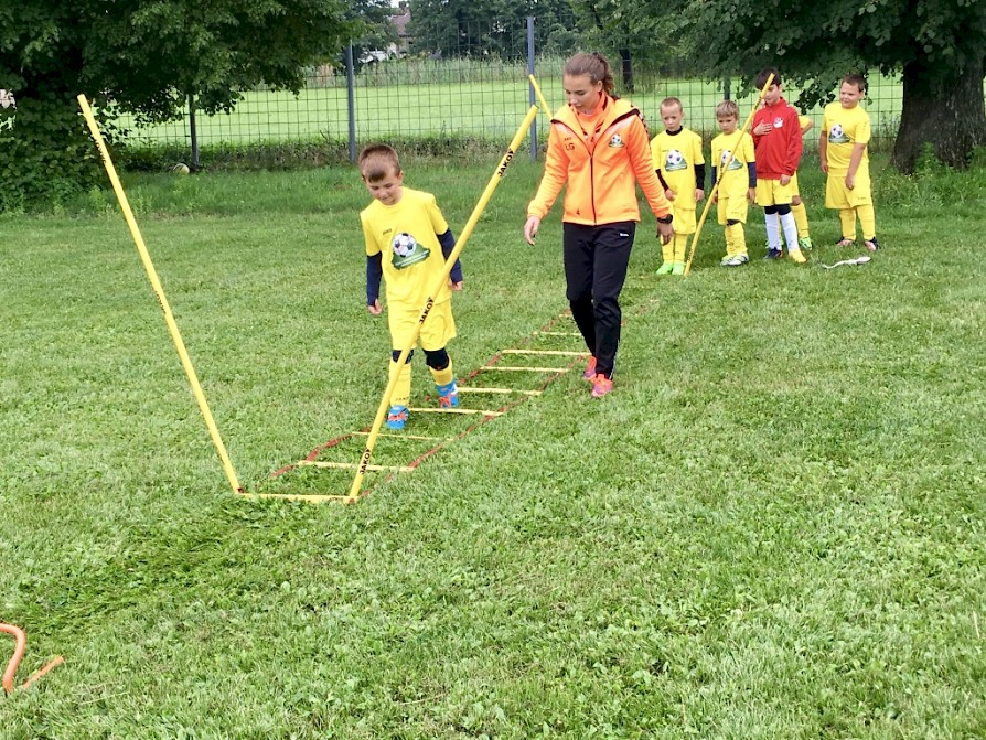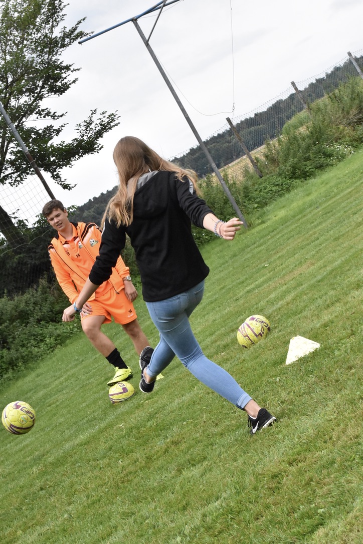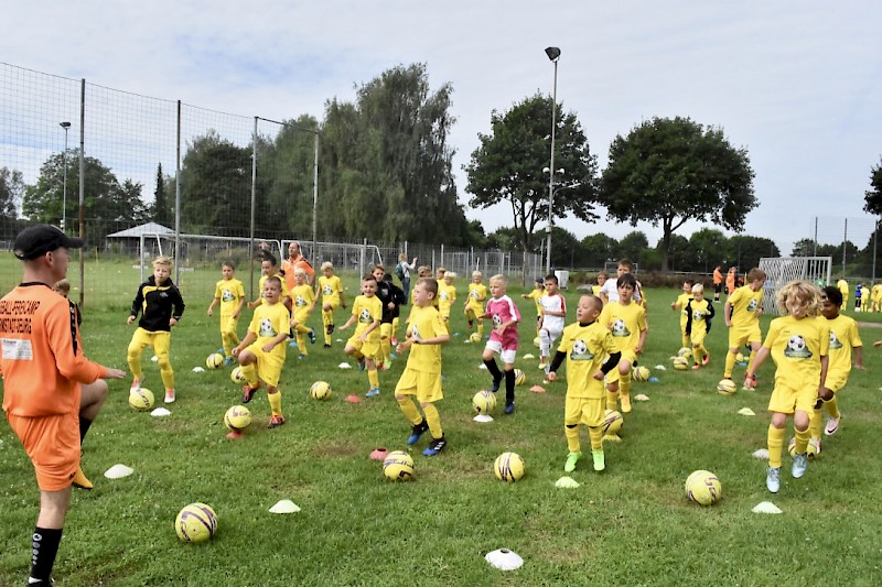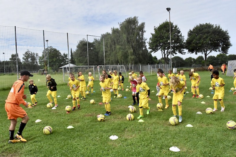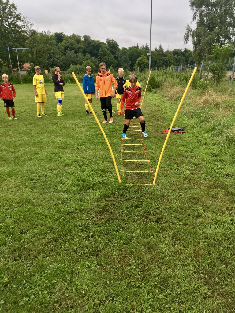 Die Wettervorhersage für die Campwoche traf zu: Regen! Bis einschließlich Mittwoch morgen. Dann ließ sich endlich die Sonne blicken, und es wurde etwas heller über der schönen Altheimer Sportanlage. Das hatten wir auch mehr als verdient. Alle Miteinander - Kids, Eltern, das Kompetenzteam mit Henni, Suzy, Jule, und Hannah , unserer Fotografin Milena, sowie den Trainern Thimo, Abu, Marc, Mareike, Laura, Philipp, Henrike, Maverick, Harry, Henrik, Tom, und Holger. Aber selbstverständlich ging's nicht erst mit der Sonne los. Unmittelbar nach der Begrüßung am Montag morgen, dem Verteilen der Ausstattung, legten wir mit den Kids auch schon los. Wie immer in 6 verschiedene Teams nach Jahrgängen eingeteilt, deckten die Trainer die gesamte Woche über mit allen fussballerischen Schwerpunkten ab. Einige Male auch mit der ein oder anderen spaßigen Wettkampfeinlage fern des runden Leders;-) Und die Kids machten wirklich klasse mit - allen machte es sichtlich Spaß. Ob morgens mit dem 'Warm up' bei Thimo, oder die Jüngsten bei Maverick (Bild unten)...