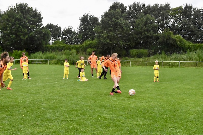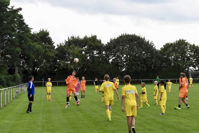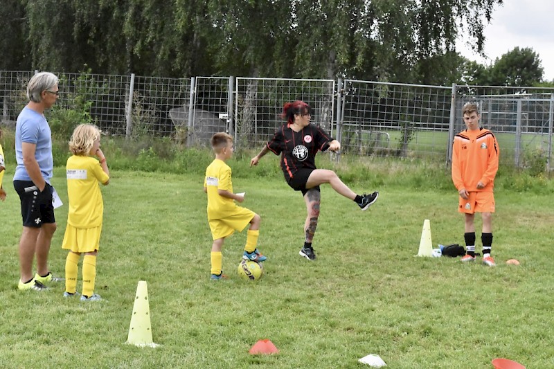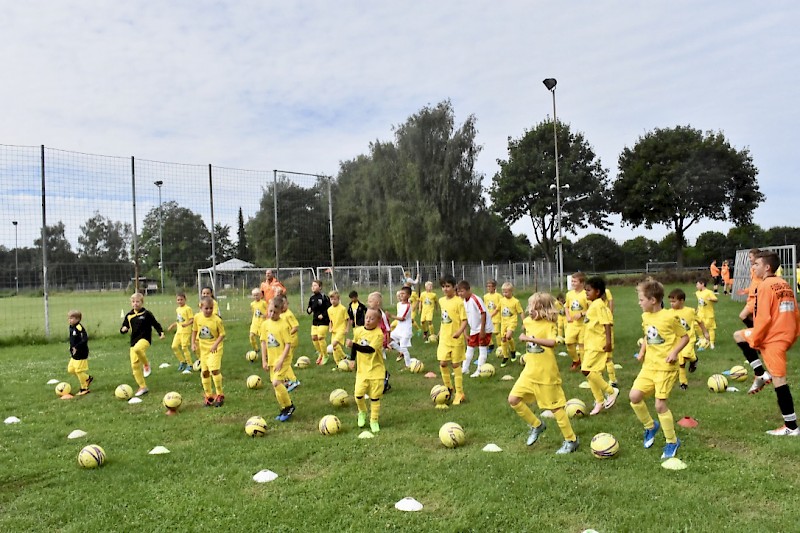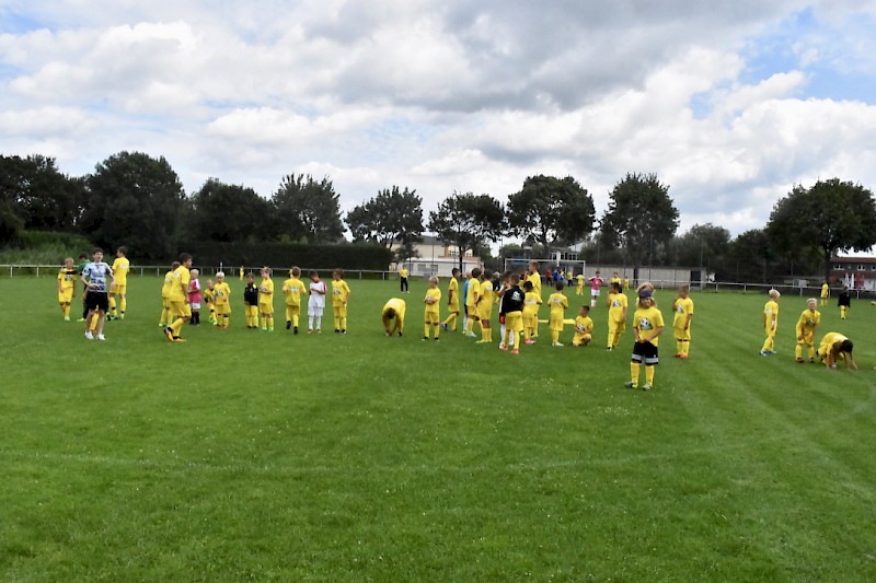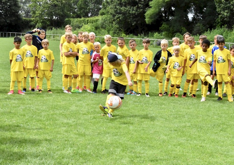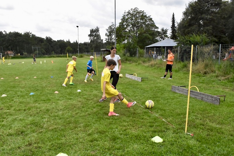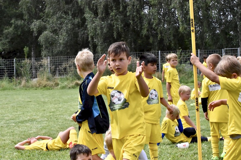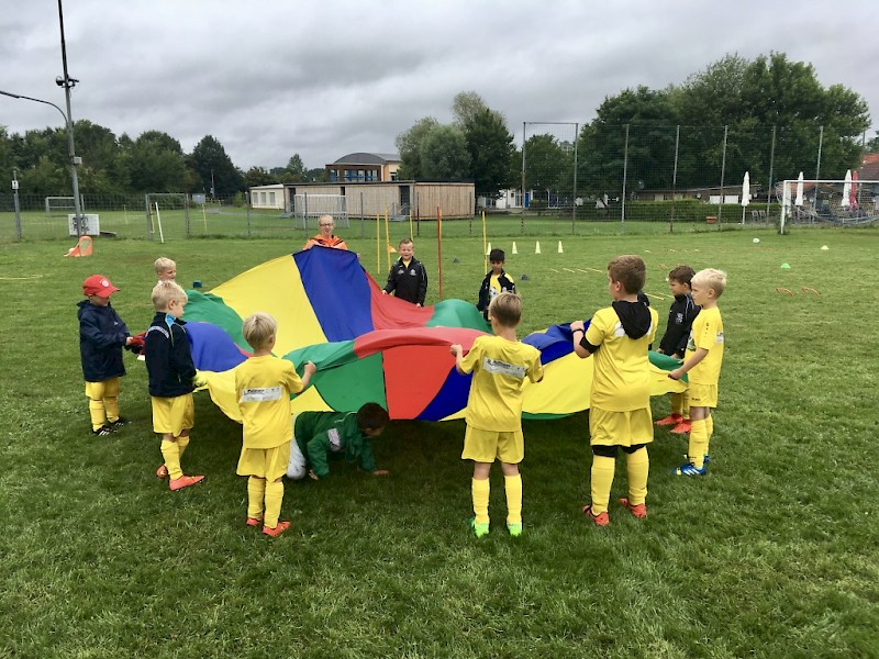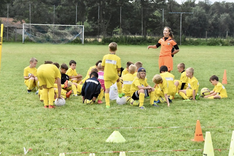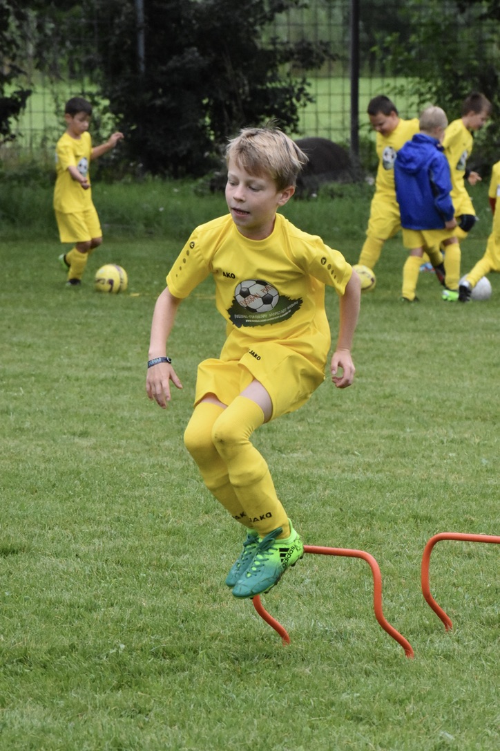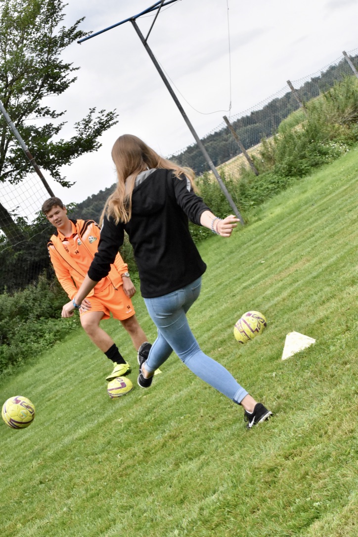 Die Wettervorhersage für die Campwoche traf zu: Regen! Bis einschließlich Mittwoch morgen. Dann ließ sich endlich die Sonne blicken, und es wurde etwas heller über der schönen Altheimer Sportanlage. Das hatten wir auch mehr als verdient. Alle Miteinander - Kids, Eltern, das Kompetenzteam mit Henni, Suzy, Jule, und Hannah , unserer Fotografin Milena, sowie den Trainern Thimo, Abu, Marc, Mareike, Laura, Philipp, Henrike, Maverick, Harry, Henrik, Tom, und Holger. Aber selbstverständlich ging's nicht erst mit der Sonne los. Unmittelbar nach der Begrüßung am Montag morgen, dem Verteilen der Ausstattung, legten wir mit den Kids auch schon los. Wie immer in 6 verschiedene Teams nach Jahrgängen eingeteilt, deckten die Trainer die gesamte Woche über mit allen fussballerischen Schwerpunkten ab. Einige Male auch mit der ein oder anderen spaßigen Wettkampfeinlage fern des runden Leders;-) Und die Kids machten wirklich klasse mit - allen machte es sichtlich Spaß. Ob morgens mit dem 'Warm up' bei Thimo, oder die Jüngsten bei Maverick (Bild unten)...