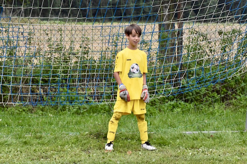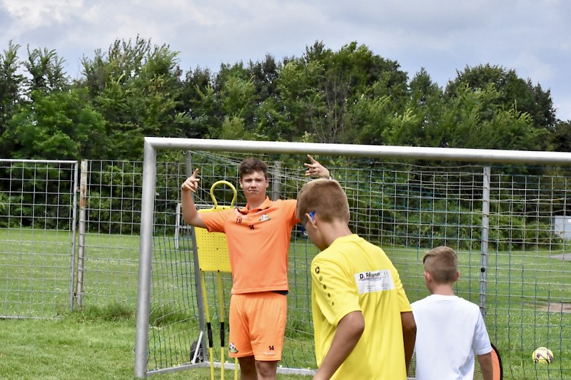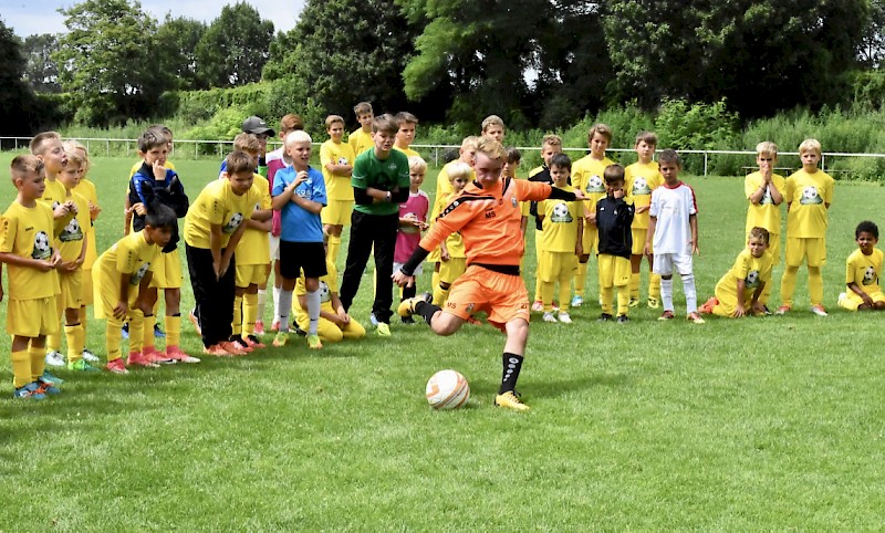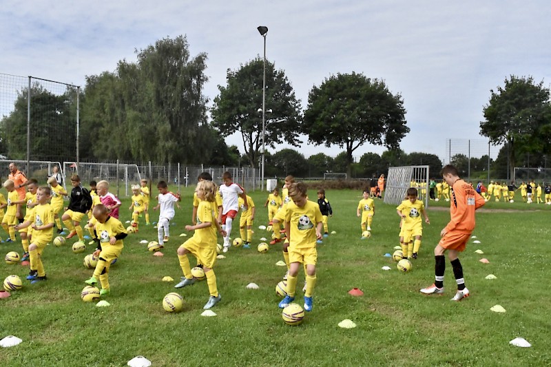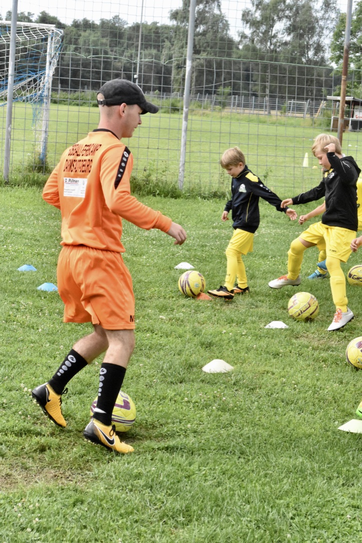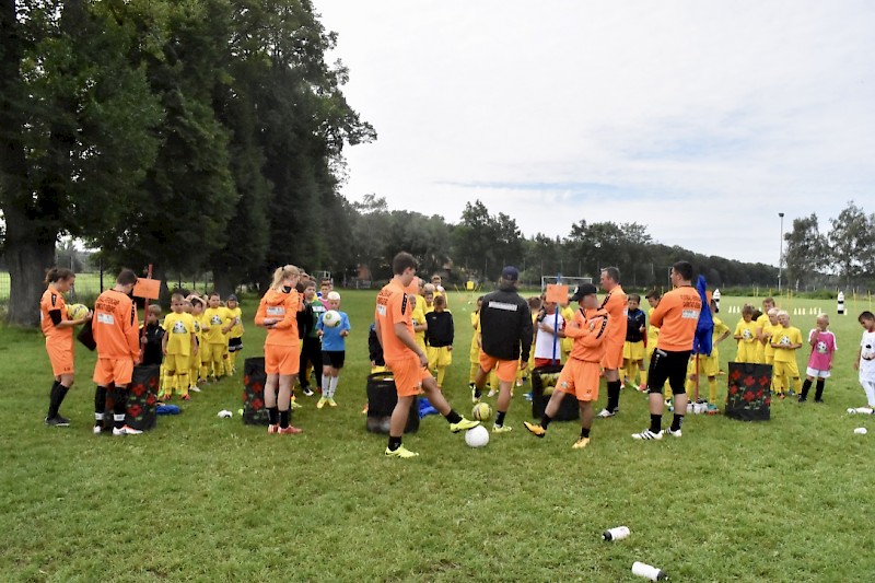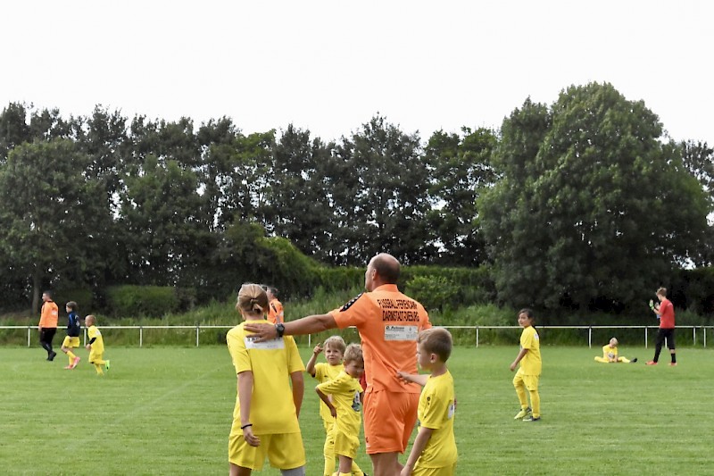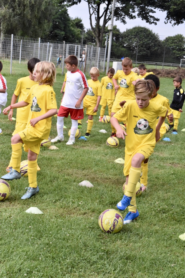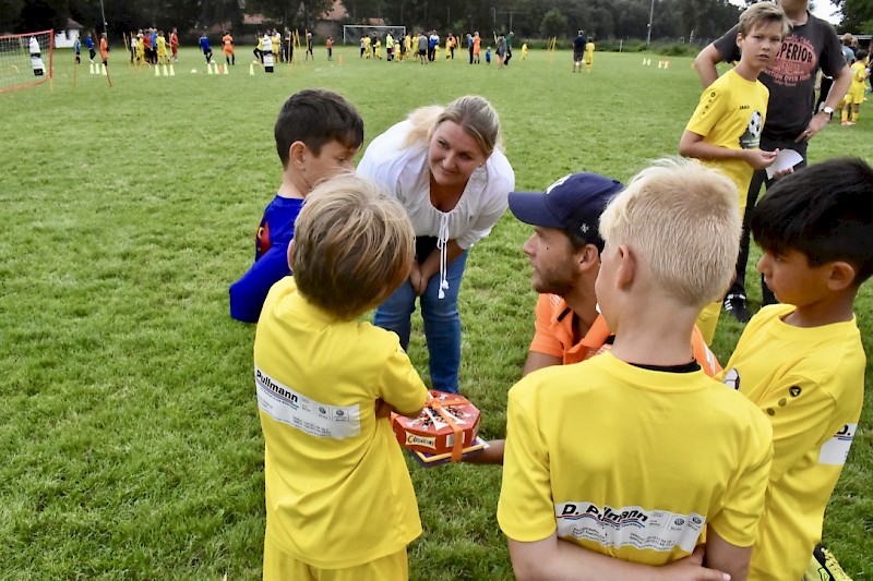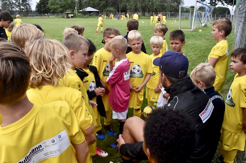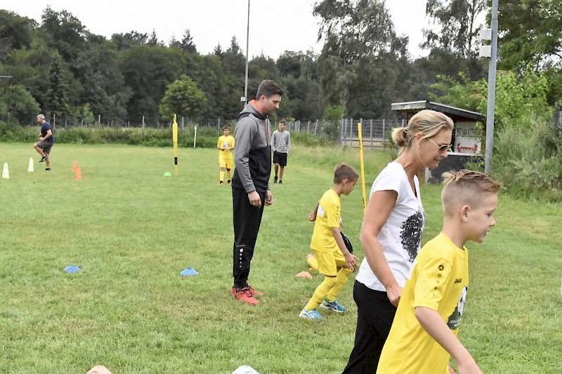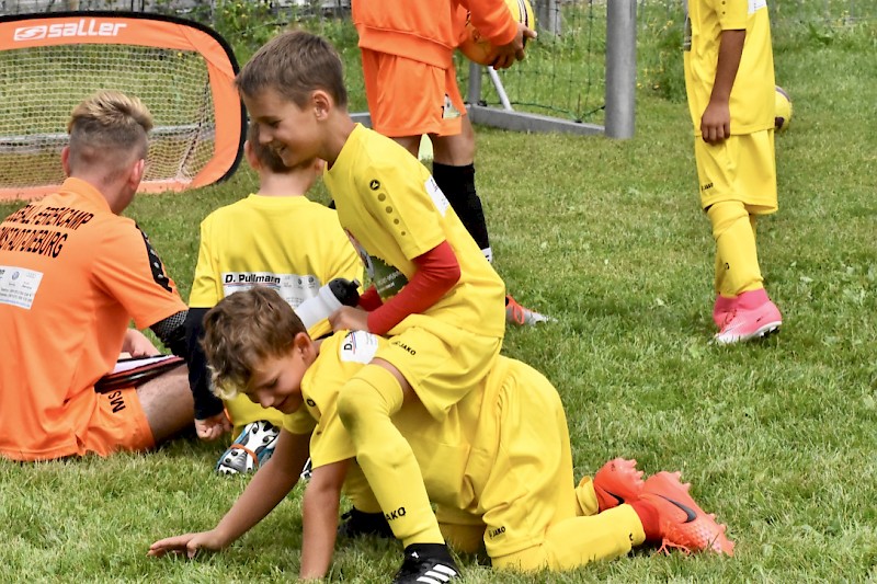 Die Wettervorhersage für die Campwoche traf zu: Regen! Bis einschließlich Mittwoch morgen. Dann ließ sich endlich die Sonne blicken, und es wurde etwas heller über der schönen Altheimer Sportanlage. Das hatten wir auch mehr als verdient. Alle Miteinander - Kids, Eltern, das Kompetenzteam mit Henni, Suzy, Jule, und Hannah , unserer Fotografin Milena, sowie den Trainern Thimo, Abu, Marc, Mareike, Laura, Philipp, Henrike, Maverick, Harry, Henrik, Tom, und Holger. Aber selbstverständlich ging's nicht erst mit der Sonne los. Unmittelbar nach der Begrüßung am Montag morgen, dem Verteilen der Ausstattung, legten wir mit den Kids auch schon los. Wie immer in 6 verschiedene Teams nach Jahrgängen eingeteilt, deckten die Trainer die gesamte Woche über mit allen fussballerischen Schwerpunkten ab. Einige Male auch mit der ein oder anderen spaßigen Wettkampfeinlage fern des runden Leders;-) Und die Kids machten wirklich klasse mit - allen machte es sichtlich Spaß. Ob morgens mit dem 'Warm up' bei Thimo, oder die Jüngsten bei Maverick (Bild unten)...