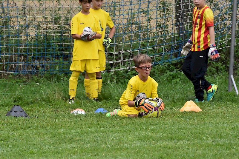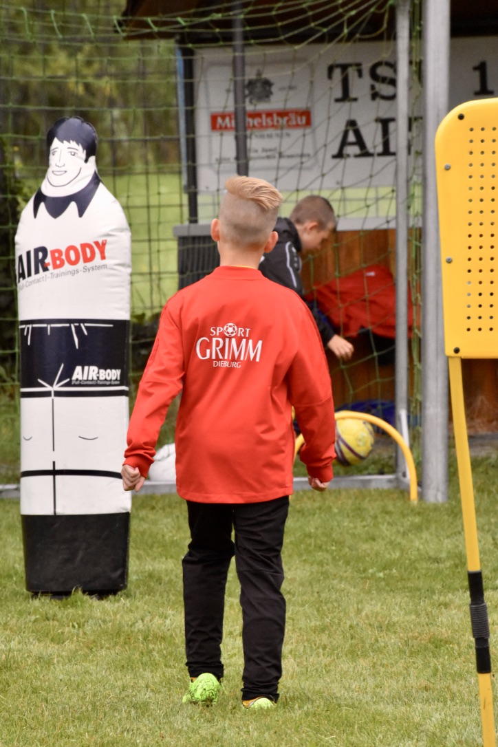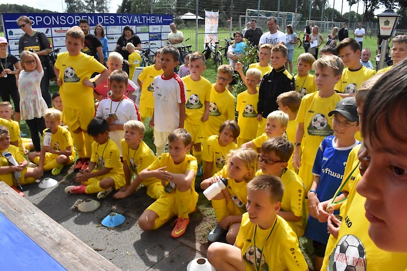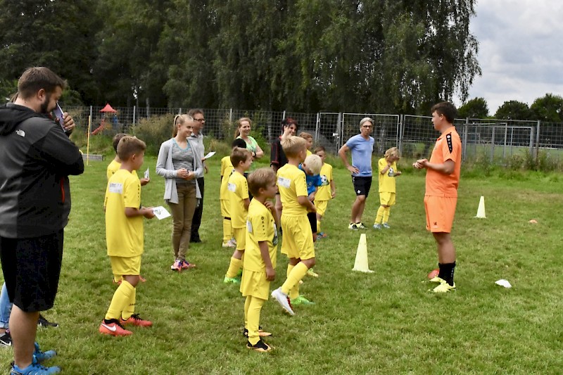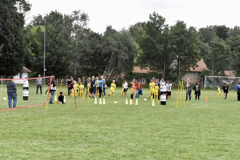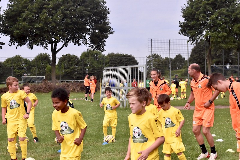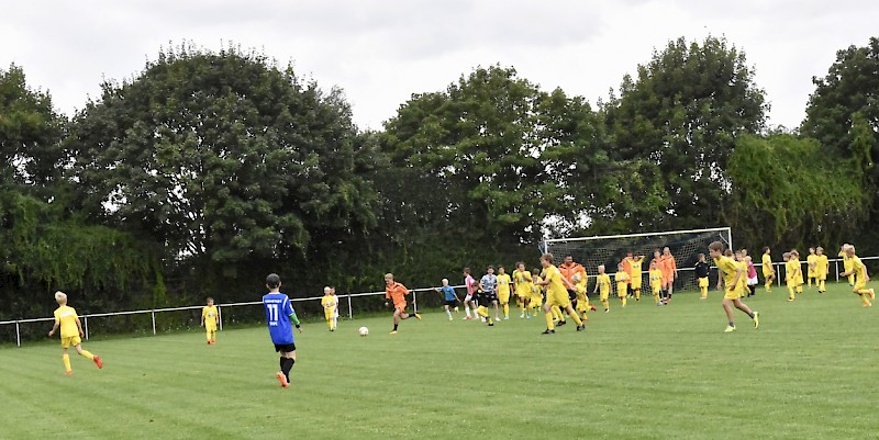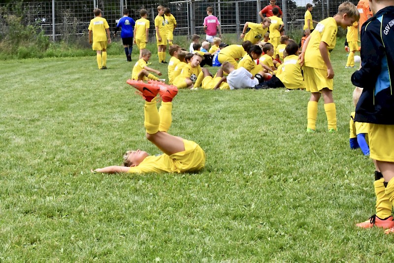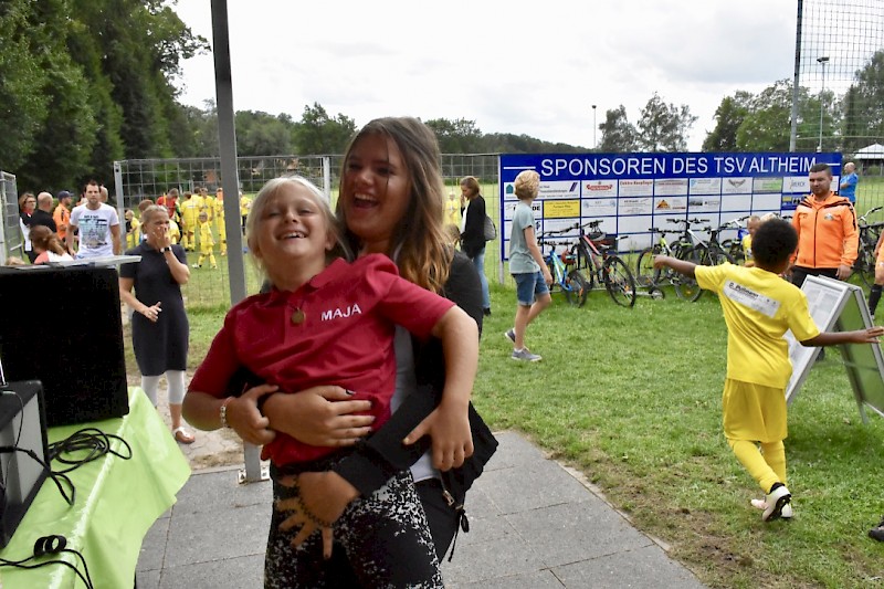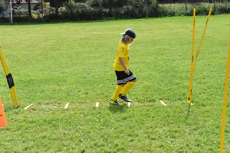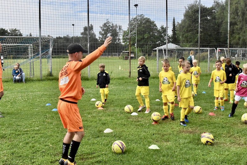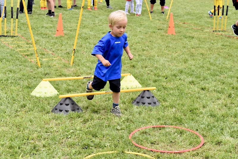 Die Wettervorhersage für die Campwoche traf zu: Regen! Bis einschließlich Mittwoch morgen. Dann ließ sich endlich die Sonne blicken, und es wurde etwas heller über der schönen Altheimer Sportanlage. Das hatten wir auch mehr als verdient. Alle Miteinander - Kids, Eltern, das Kompetenzteam mit Henni, Suzy, Jule, und Hannah , unserer Fotografin Milena, sowie den Trainern Thimo, Abu, Marc, Mareike, Laura, Philipp, Henrike, Maverick, Harry, Henrik, Tom, und Holger. Aber selbstverständlich ging's nicht erst mit der Sonne los. Unmittelbar nach der Begrüßung am Montag morgen, dem Verteilen der Ausstattung, legten wir mit den Kids auch schon los. Wie immer in 6 verschiedene Teams nach Jahrgängen eingeteilt, deckten die Trainer die gesamte Woche über mit allen fussballerischen Schwerpunkten ab. Einige Male auch mit der ein oder anderen spaßigen Wettkampfeinlage fern des runden Leders;-) Und die Kids machten wirklich klasse mit - allen machte es sichtlich Spaß. Ob morgens mit dem 'Warm up' bei Thimo, oder die Jüngsten bei Maverick (Bild unten)...