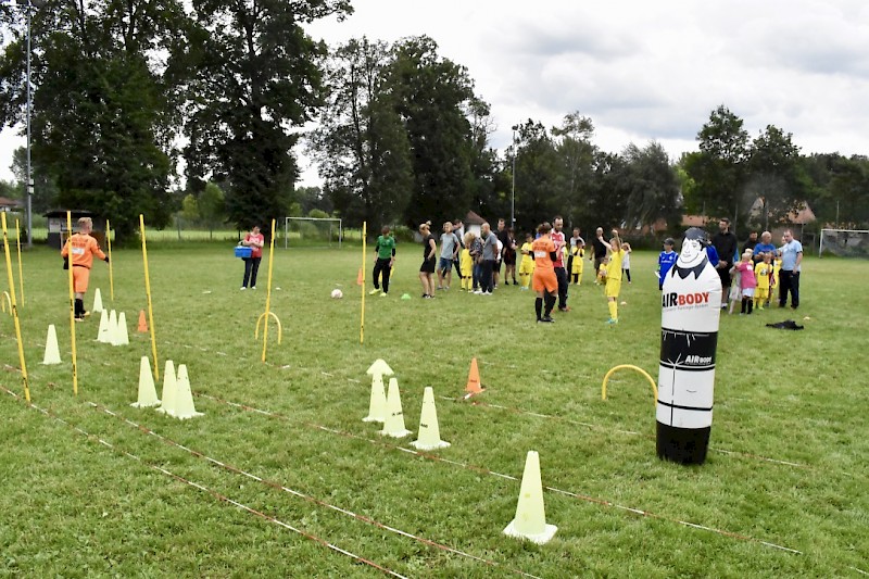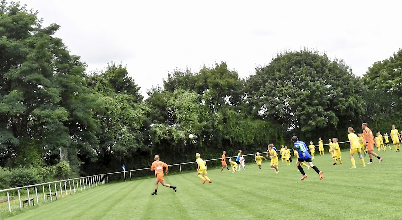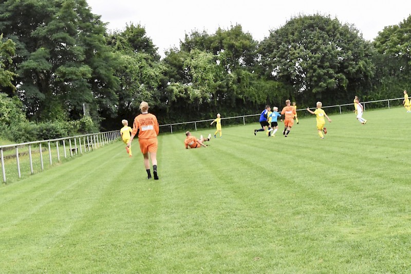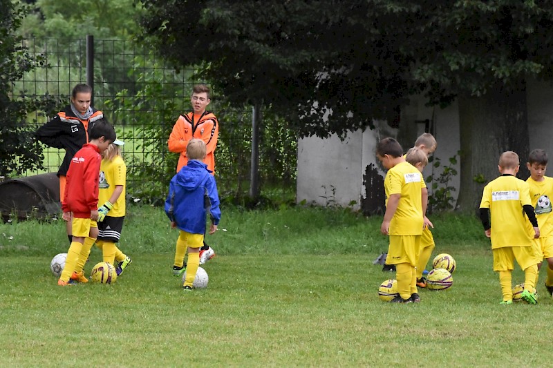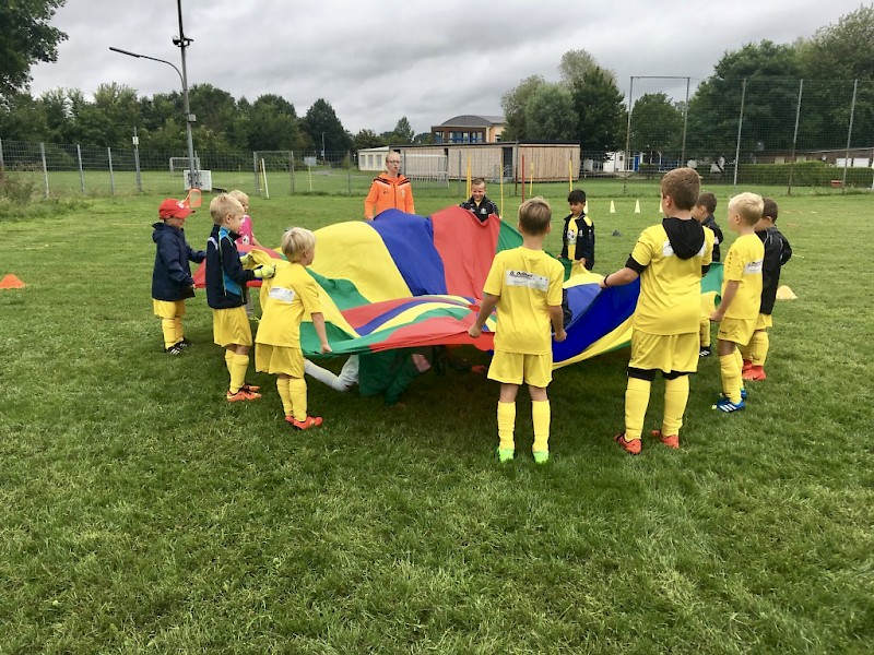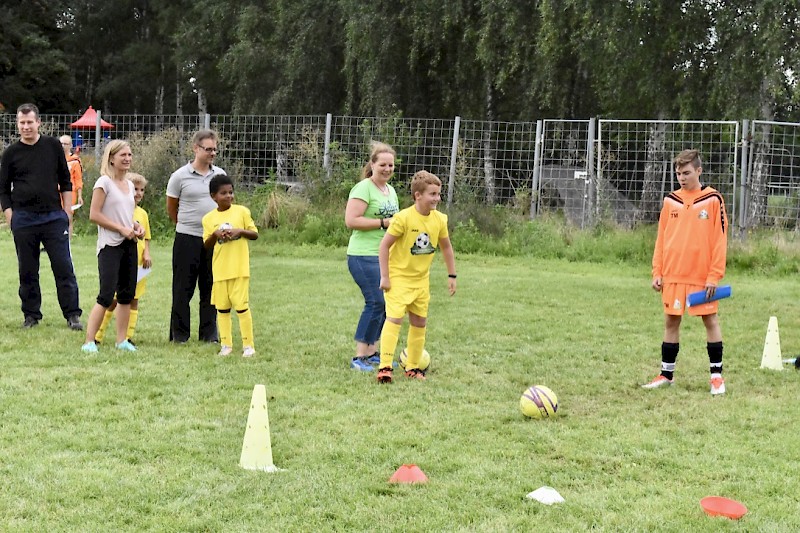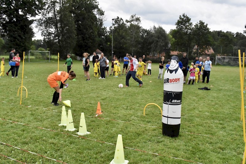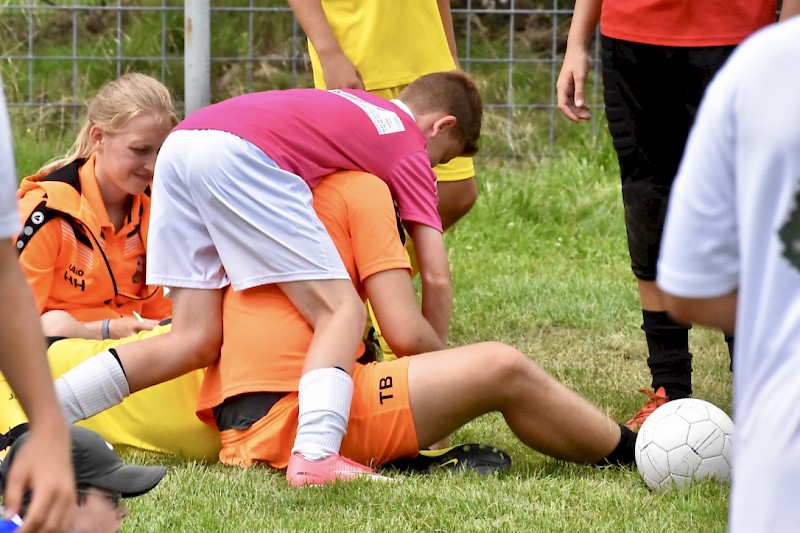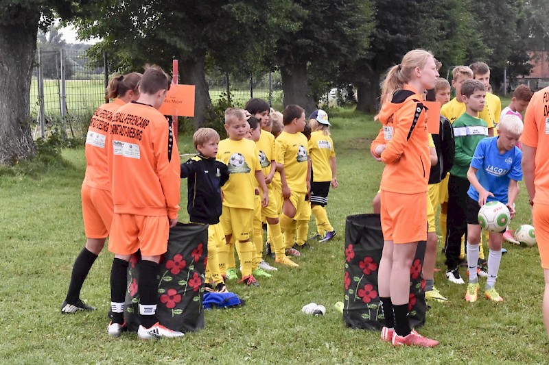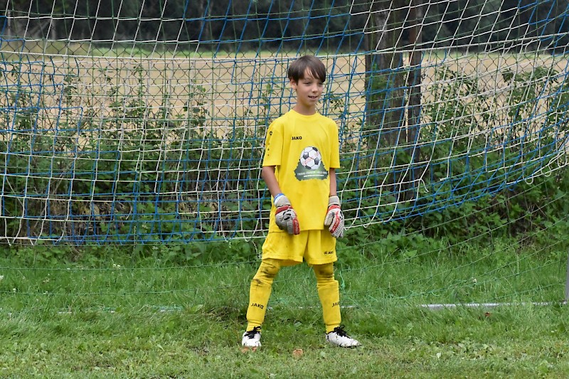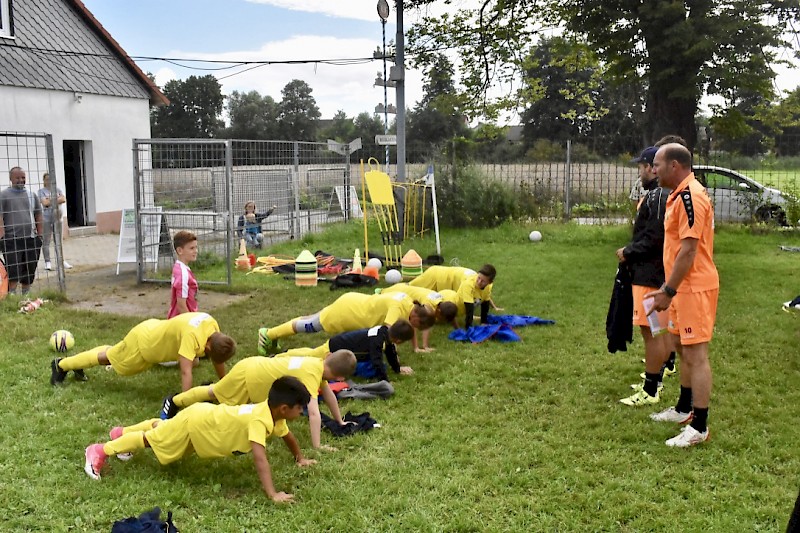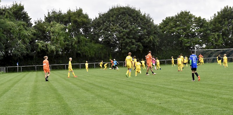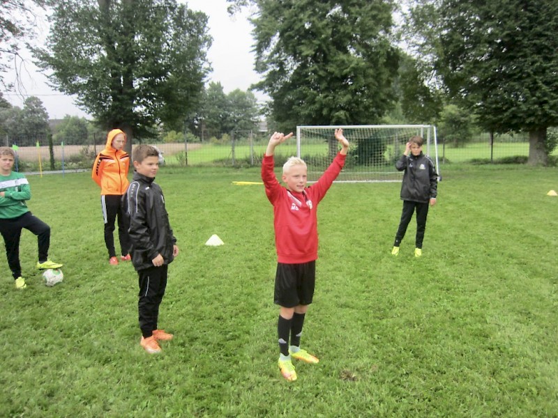 Die Wettervorhersage für die Campwoche traf zu: Regen! Bis einschließlich Mittwoch morgen. Dann ließ sich endlich die Sonne blicken, und es wurde etwas heller über der schönen Altheimer Sportanlage. Das hatten wir auch mehr als verdient. Alle Miteinander - Kids, Eltern, das Kompetenzteam mit Henni, Suzy, Jule, und Hannah , unserer Fotografin Milena, sowie den Trainern Thimo, Abu, Marc, Mareike, Laura, Philipp, Henrike, Maverick, Harry, Henrik, Tom, und Holger. Aber selbstverständlich ging's nicht erst mit der Sonne los. Unmittelbar nach der Begrüßung am Montag morgen, dem Verteilen der Ausstattung, legten wir mit den Kids auch schon los. Wie immer in 6 verschiedene Teams nach Jahrgängen eingeteilt, deckten die Trainer die gesamte Woche über mit allen fussballerischen Schwerpunkten ab. Einige Male auch mit der ein oder anderen spaßigen Wettkampfeinlage fern des runden Leders;-) Und die Kids machten wirklich klasse mit - allen machte es sichtlich Spaß. Ob morgens mit dem 'Warm up' bei Thimo, oder die Jüngsten bei Maverick (Bild unten)...
