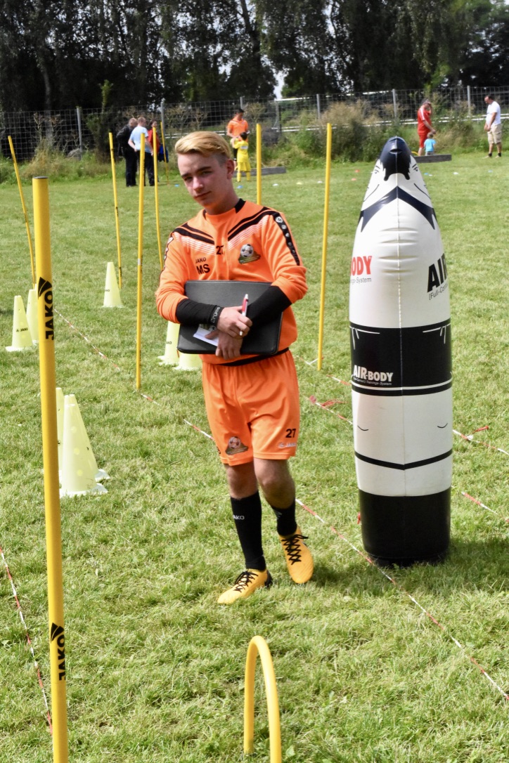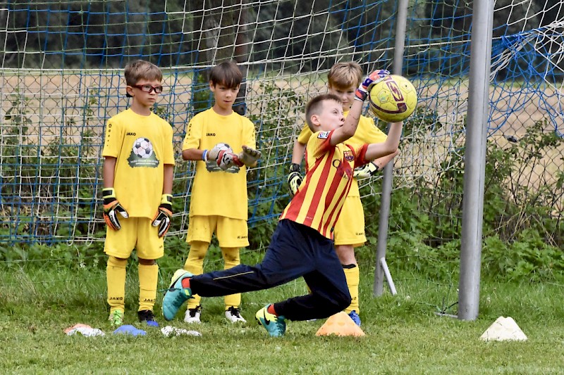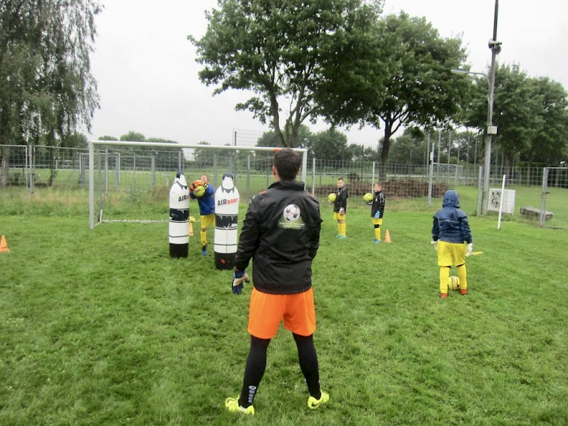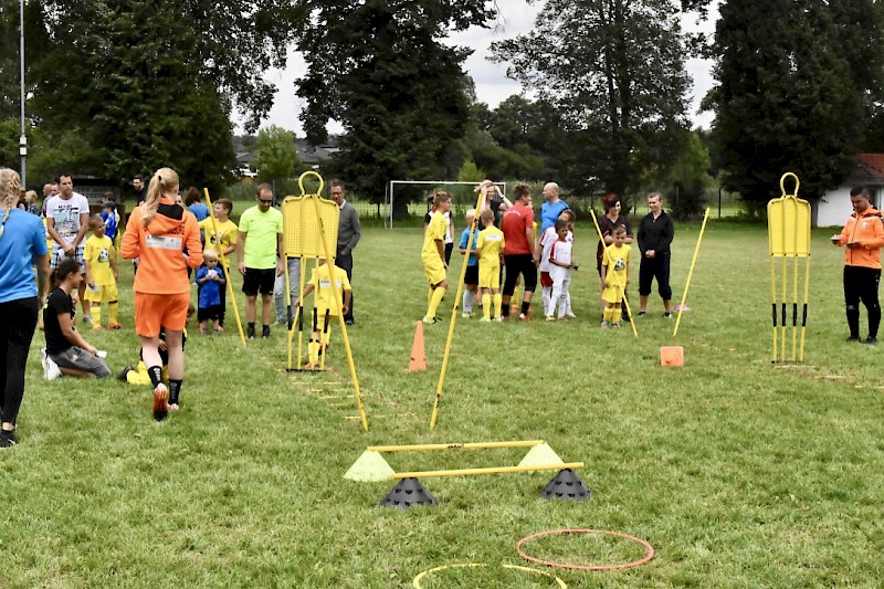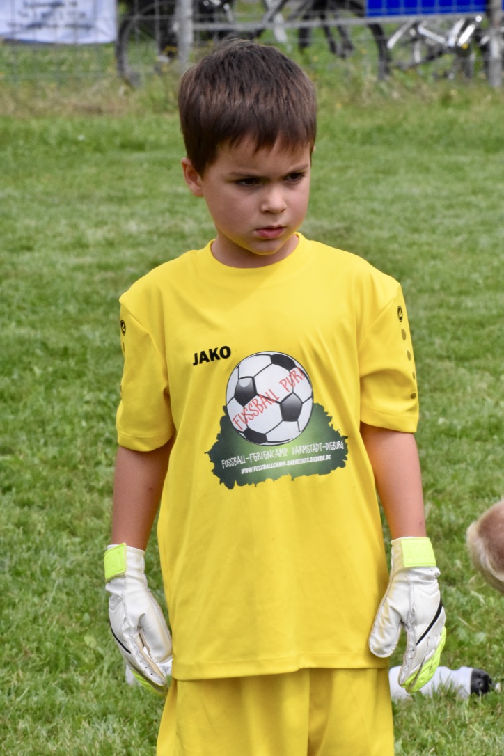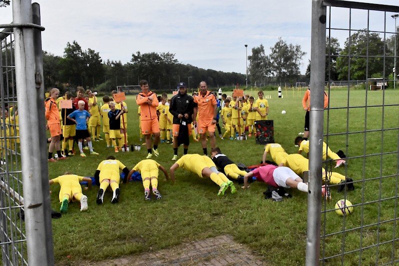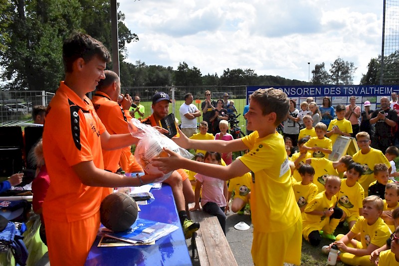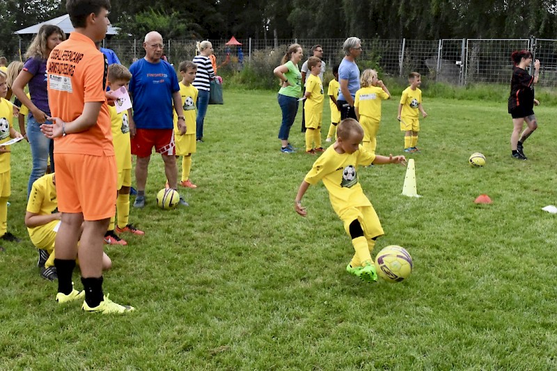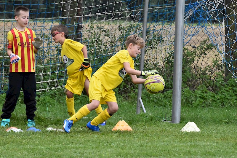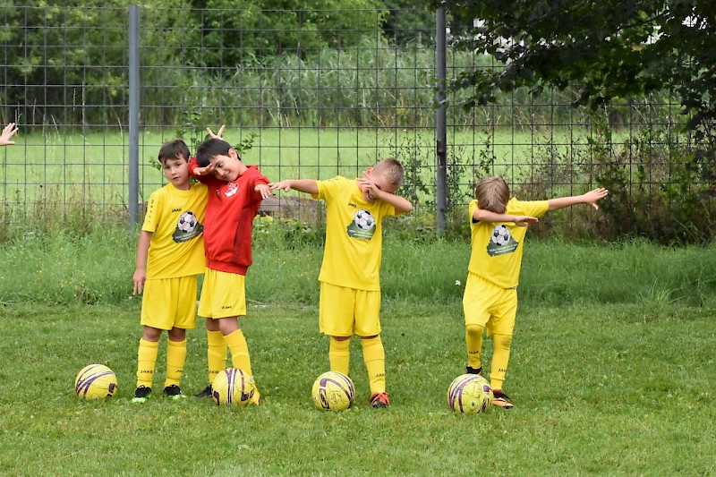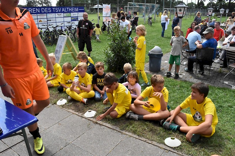 Die Wettervorhersage für die Campwoche traf zu: Regen! Bis einschließlich Mittwoch morgen. Dann ließ sich endlich die Sonne blicken, und es wurde etwas heller über der schönen Altheimer Sportanlage. Das hatten wir auch mehr als verdient. Alle Miteinander - Kids, Eltern, das Kompetenzteam mit Henni, Suzy, Jule, und Hannah , unserer Fotografin Milena, sowie den Trainern Thimo, Abu, Marc, Mareike, Laura, Philipp, Henrike, Maverick, Harry, Henrik, Tom, und Holger. Aber selbstverständlich ging's nicht erst mit der Sonne los. Unmittelbar nach der Begrüßung am Montag morgen, dem Verteilen der Ausstattung, legten wir mit den Kids auch schon los. Wie immer in 6 verschiedene Teams nach Jahrgängen eingeteilt, deckten die Trainer die gesamte Woche über mit allen fussballerischen Schwerpunkten ab. Einige Male auch mit der ein oder anderen spaßigen Wettkampfeinlage fern des runden Leders;-) Und die Kids machten wirklich klasse mit - allen machte es sichtlich Spaß. Ob morgens mit dem 'Warm up' bei Thimo, oder die Jüngsten bei Maverick (Bild unten)...