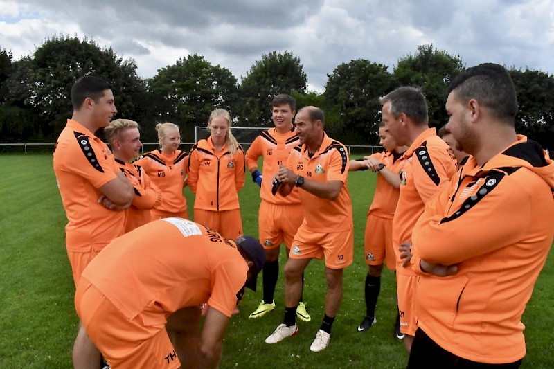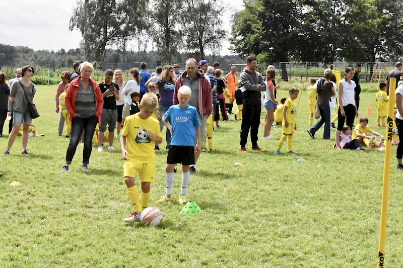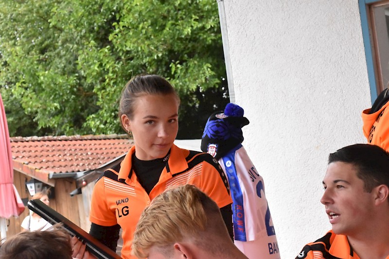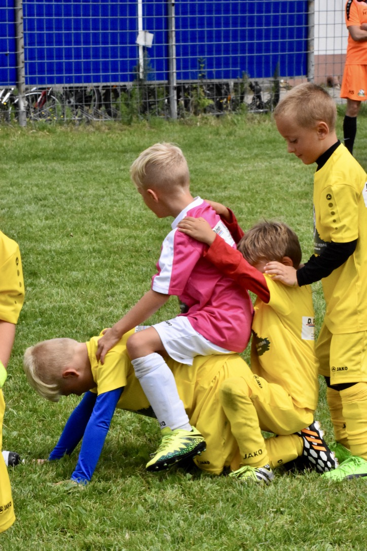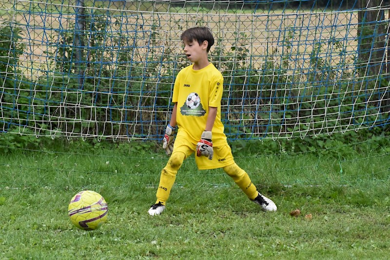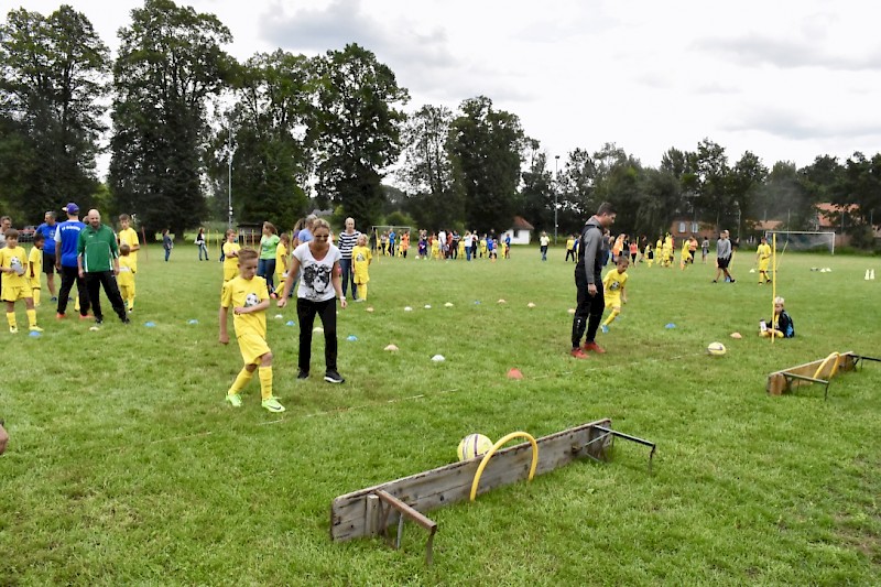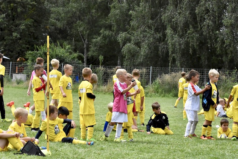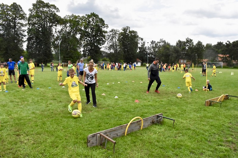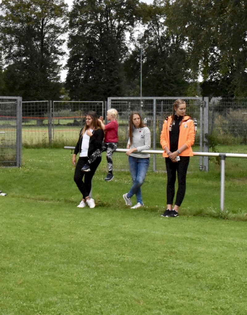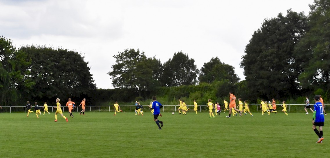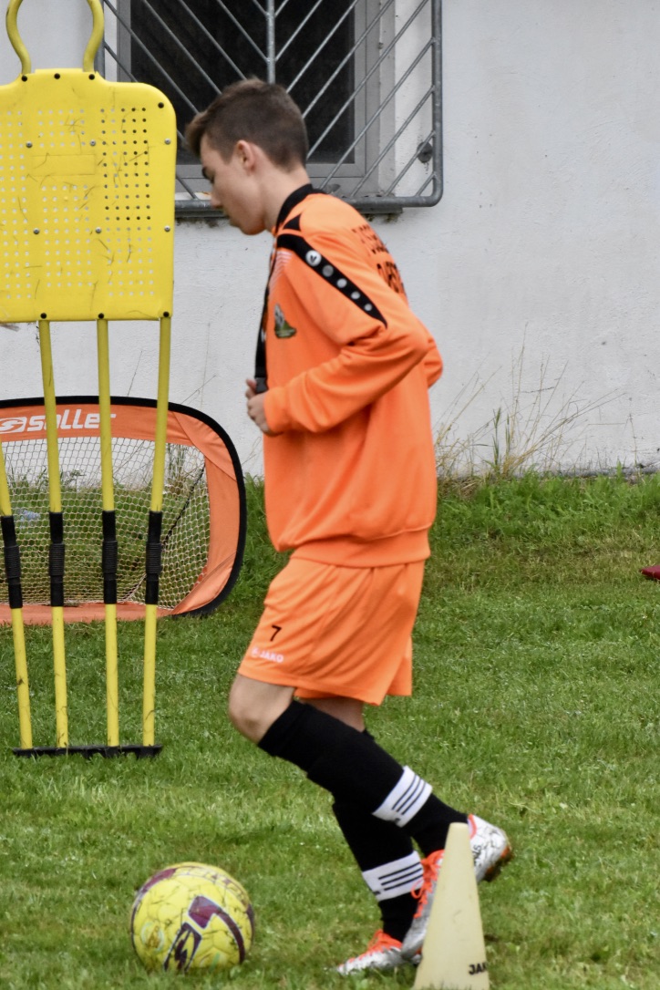 Die Wettervorhersage für die Campwoche traf zu: Regen! Bis einschließlich Mittwoch morgen. Dann ließ sich endlich die Sonne blicken, und es wurde etwas heller über der schönen Altheimer Sportanlage. Das hatten wir auch mehr als verdient. Alle Miteinander - Kids, Eltern, das Kompetenzteam mit Henni, Suzy, Jule, und Hannah , unserer Fotografin Milena, sowie den Trainern Thimo, Abu, Marc, Mareike, Laura, Philipp, Henrike, Maverick, Harry, Henrik, Tom, und Holger. Aber selbstverständlich ging's nicht erst mit der Sonne los. Unmittelbar nach der Begrüßung am Montag morgen, dem Verteilen der Ausstattung, legten wir mit den Kids auch schon los. Wie immer in 6 verschiedene Teams nach Jahrgängen eingeteilt, deckten die Trainer die gesamte Woche über mit allen fussballerischen Schwerpunkten ab. Einige Male auch mit der ein oder anderen spaßigen Wettkampfeinlage fern des runden Leders;-) Und die Kids machten wirklich klasse mit - allen machte es sichtlich Spaß. Ob morgens mit dem 'Warm up' bei Thimo, oder die Jüngsten bei Maverick (Bild unten)...