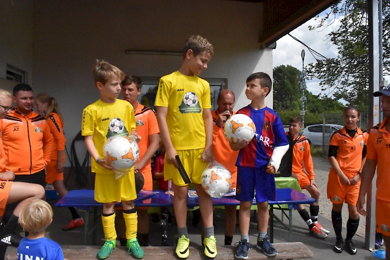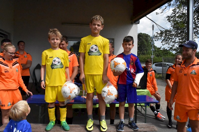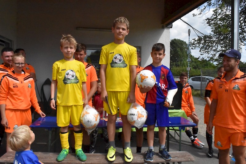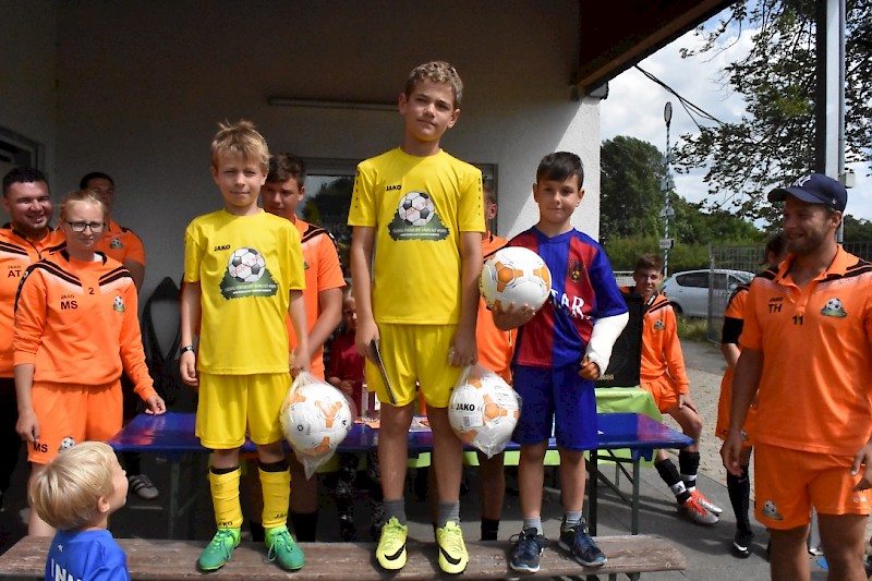 Die Campabzeichen-Gewinner hießen Joshua H. (Jg. 2007, links), Janne M., ( Jg. 2005, Mitte), und unser tapferster Nachwuchskicker Felix C. (Jg. 2010, rechts). Alle 3 freuten sich ebenfalls über je 2 Eintrittskarten von Adventure-Golf Groß-Zimmern, und je einen neuen JAKO - Ball von Sport-Grimm Dieburg.