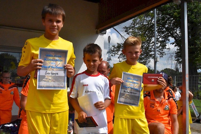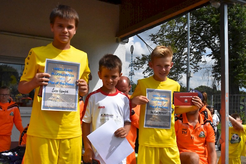 Unsere 'Man of the Games' mit Urkunde&Einkaufsgutschein von Sport-Grimm Dieburg, v.l.n.r. Luca G. (Jg. 2004), Marcel D. (Jg. 2010), und Ben-Luca H. (Jg. 2007).
